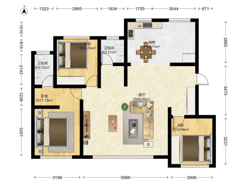 房屋戶型: 3 室2廳 1 廚2衛(wèi)